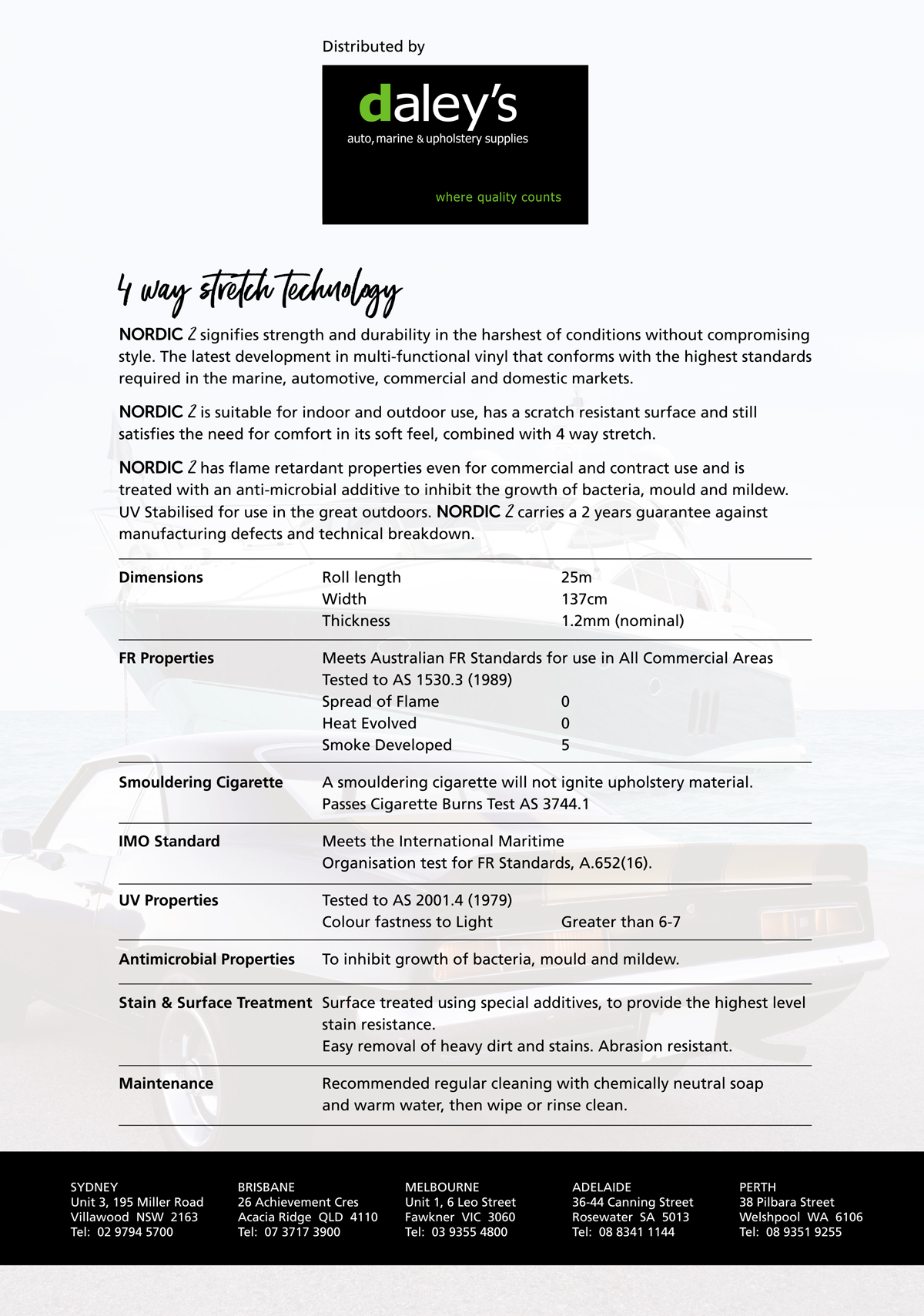 All new Nordic 2 now incorporates 4-way Stretch Technology and signifies strength and durability in the harshest of conditions without compromising style. It is a high-quality multi-functional vinyl suitable for the marine, automotive, commercial and domestic markets. Suitable for indoor and outdoor use, it has a scratch resistant surface and its soft feel provides the ultimate in comfort. Nordic 2 has flame retardant properties to satisfy requirements in commercial and contract environments, it is treated with an anti-microbial additive and is UV stabilised for use in the great outdoors.